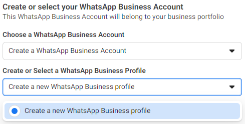 - Choose “Create a WhatsApp Business Account” and in the next dropdown, “Create a new WhatsApp Business Profile.”
