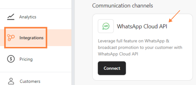 Step 1: Access Integrations- Navigate to the “Integrations” dashboard. Select “Connect” in WhatsApp Cloud API.