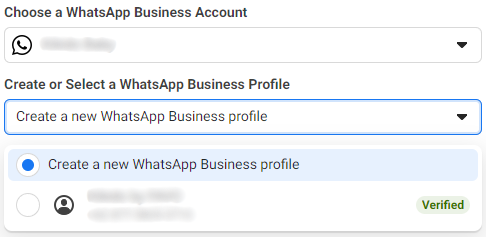 - Or select an existing “WhatsApp Business account” and, in the “Create or choose WhatsApp Business Profile” dropdown, choose to “Create a new WhatsApp Business profile.”