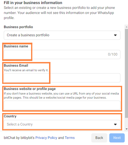 - Create a business portfolio and fill in details like “Business name,” “Business email,” “Business website or profile page,” and “Country”.